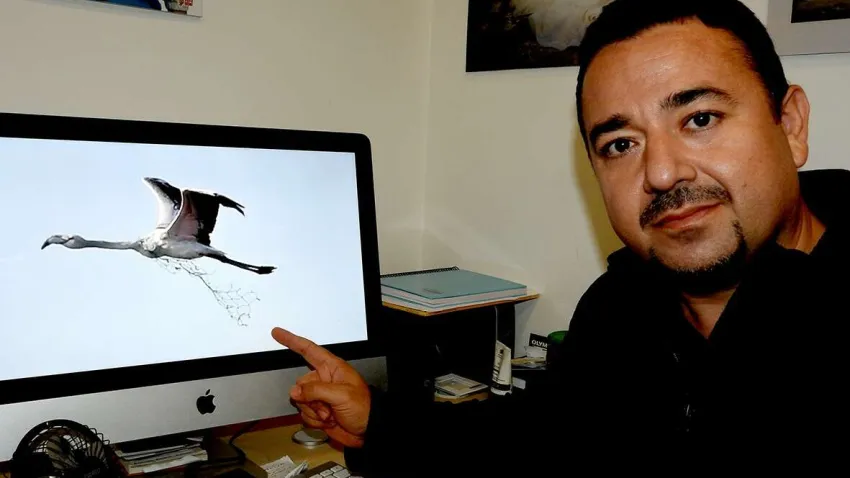 Alaçatı Sulak Alan'da fotoğraf çekerken bir flamingonun boynuna bir şeyin takıldığını farkeden Halil Soytürk, kuşa yaklaştığında boynunda bir balık ağı olduğunu gördü. Flamingonun uçması üzerine o üzücü halini havada fotoğraflayabilen Soytürk, denizlerdeki kirliliğinin ne boyuta geldiğini de ortaya sermiş oldu.