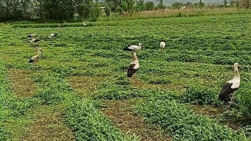 Tarlaya giren leylekler ilginç görüntüler oluşturdu
