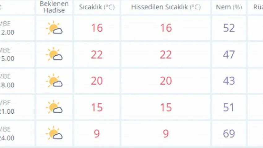 Gece saatlerinde ise saat 21.00 ile 24.00 arasında hava sıcaklığı 9 derece olacak. Hissedilen sıcaklık da 9 derece olacak. Nem oranı ise yüzde 69 olarak kaydedilecek. Rüzgar kuzey yönünden esecek.