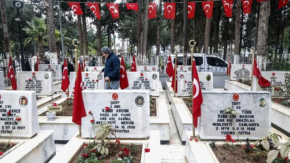 Toroslar ilçesinde Şehir Mezarlığı'ndaki şehitliğe giden aileler, Türk bayraklarıyla donatılmış mezarlara çiçek bıraktı.