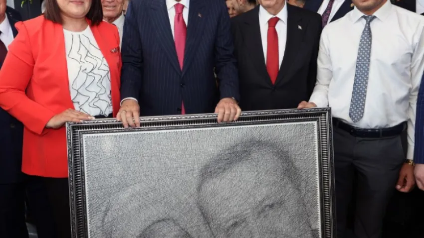 Cumhurbaşkanı Recep Tayyip Erdoğan'a Kuzey Kıbrıs Türk Cumhuriyeti'nde (KKTC) annesi Tenzile Erdoğan ile birlikte portresinin işlendiği filografi tablo hediye edildi
