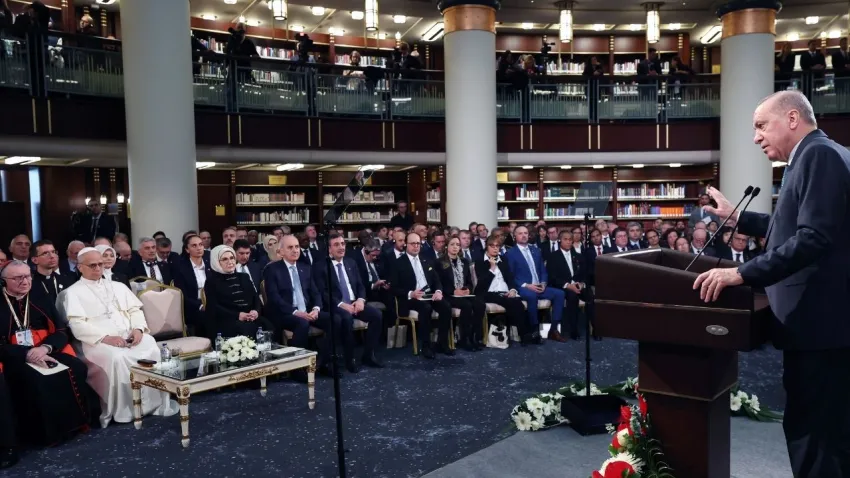 Cumhurbaşkanı Erdoğan ile Papa 14'üncü Leo, ikili ve heyetler arası görüşmenin ardından Cumhurbaşkanlığı Millet Kütüphanesi'ndeki Cihannüma Salonu'nda basın toplantısı düzenledi. Cumhurbaşkanı Erdoğan, "Saygıdeğer Papa 14'üncü Leo'yu ve heyetini ülkemizde misafir etmekten büyük bir memnuniyet duyuyorum. Bir kez de sizlerin huzurunda kıymetli misafirimiz ve heyetine ülkemize hoş geldiniz diyorum. Kendilerinin göreve başladıktan sonra ilk yurt dışı seyahatini Türkiye'ye gerçekleştirmesini her bakımdan çok anlamlı buluyorum. Bu müstesna ziyaretin Türkiye ile Vatikan arasındaki köklü ilişkilerin; dostluk, iş birliği ve karşılıklı anlayış temelinde güçlenmesine katkı sağlamasını canı gönülden temenni ediyorum. Başta bu salondan yansıyanlar olmak üzere ziyaret boyunca Türkiye'den verilecek mesajların Türk-İslam dünyasına, tüm Hristiyan coğrafyasına ulaşacağına, dünyada barış umutlarını daha da artıracağına yürekten inanıyorum" dedi.