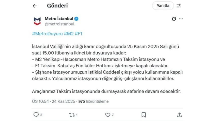 Metro İstanbul'un sosyal medya hesabından yapılan paylaşımda, "İstanbul Valiliği'nin aldığı karar doğrultusunda 25 Kasım 2025 Salı günü saat 15.00 itibarıyla ikinci bir duyuruya kadar; M2 Yenikapı-Hacıosman Metro Hattımızın Taksim istasyonu ve F1 Taksim-Kabataş Füniküler Hattımız işletmeye kapalı olacaktır. Şişhane istasyonumuzun İstiklal Caddesi çıkışı yolcu kullanımına kapalı olacaktır. Yolcularımız istasyonun diğer giriş-çıkışlarını kullanabilirler. Araçlarımız Taksim istasyonunda durmayarak seferine devam edecektir" açıklaması yer aldı.
