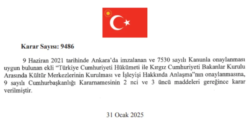 Resmi Gazete’nin 1 Şubat 2025 tarihli sayısında, Cumhurbaşkanı Recep Tayyip Erdoğan’ın imzasıyla yayımlanan karara göre, Türkiye ile Kazakistan arasında kültür merkezleri kurulmasını öngören anlaşma kabul edildi.