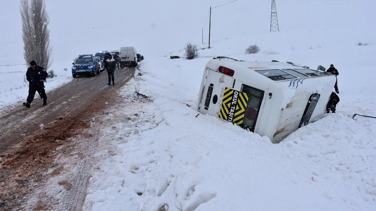 Sivas’ın Yıldızeli ilçesi Güneykaya beldesi yakınlarında sabah saat 08.30 sıralarında servis minibüsü şarampole devrildi. Çevre köylerden öğrencileri Güneykaya’daki okullara taşıyan 58 AHA 260 plakalı minibüs, kar yağışı nedeniyle kayganlaşan yolda sürücünün kontrolünü kaybetmesi sonucu devrildi.