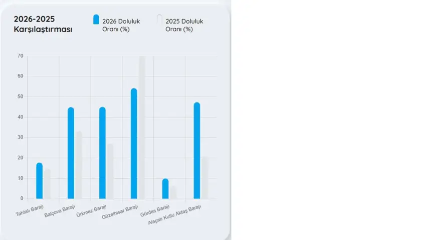 İZSU’nun paylaştığı verilere göre Alaçatı Kutlu Aktaş Barajı geçen yıla kıyasla doluluk oranının en fazla artıran baraj oldu. Geçen yıl yüzde 20,96 aktif doluluk oranına sahip barajda bugün yüzde 47,34 oranında su bulunduğunu belirten İZSU, Gördes Barajında yüzde 9,96, Ürkmez Barajında 45,05, Balçova Barajında 44,91 ve Tahtalı Barajında ise yüzde 17,75 oranında su bulunduğunu ifade etti. Geçtiğimiz yıla kıyasla doluluk oranı bu yıl daha az olan tek barajın Güzelhisar Barajı olduğunu açıklayan İZSU, geçen yıl yüzde 69,80 oranında su bulunduran barajın bu yıl yüzde 54,22 oranında dolu olduğunu belirtti.
