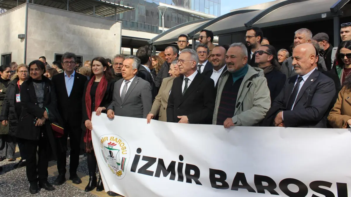 BERKAY ERDEN / İzmir Barosu’nun eski yönetiminin yargılandığı davadan beraat kararı çıkmasının ardından İzmir Barosu, İzmir Adliyesi önünde bir basın açıklaması gerçekleştirdi. İzmir Barosu başkanı Sefa Yılmaz tarafından yapılan açıklamada biat etmedikleri için yargılandıkları vurgulanırken söz konusu basın açıklamasına 19 Mart eylemleri sonrası cumhurbaşkanına hakaret suçlamasıyla tutuklanan 4 gencin bugün adliyede görülen duruşmasına katılan Cumhuriyet Halk Partisi Genel Başkan Yardımcısı Gökçe Gökçen ve Cumhuriyet Halk Partisi İzmir Milletvekili Yüksel Taşkın da destek verdi