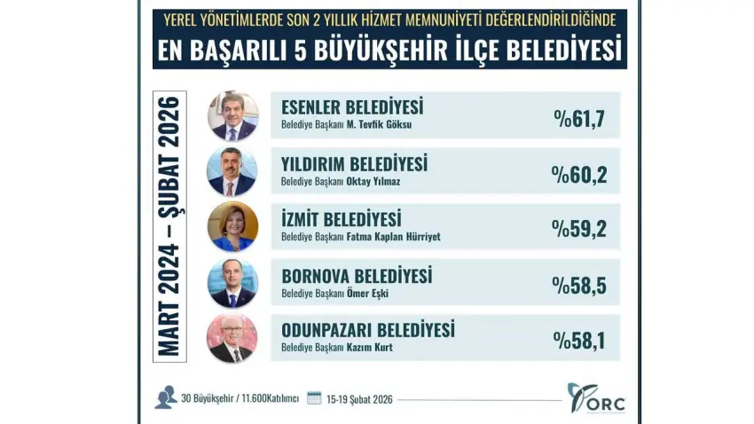 Listenin ilk sırasında Esenler Belediyesi yüzde 61,7 ile yer alırken, Yıldırım Belediyesi yüzde 60,2 ile ikinci, İzmit Belediyesi yüzde 59,2 ile üçüncü sırada yer aldı. Bornova Belediyesi dördüncü sıraya yerleşirken, Odunpazarı Belediyesi yüzde 58,1 ile beşinci oldu.
