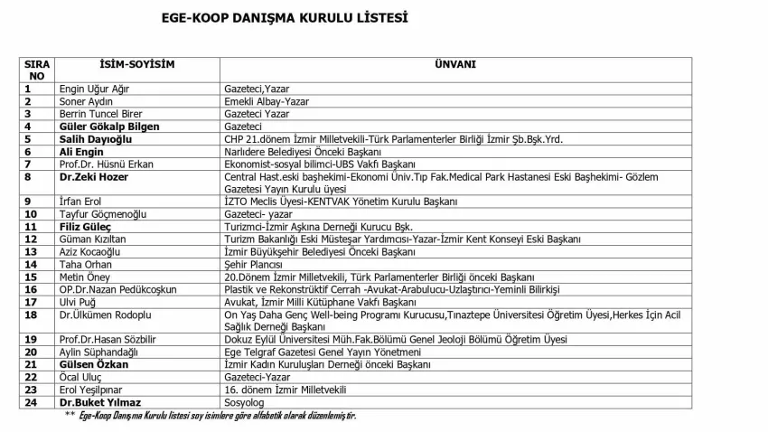 Ege-Koop Danışma Kurulu, 2025-2026 dönemi ilk toplantısını, siyaset, akademi, ekonomi, eğitim ve basın dünyasının önde gelen isimlerinden oluşan yeni üyelerin de katılımıyla gerçekleştirdi. Ege-Koop Yönetim Kurulu Başkanı Hüseyin Aslan'ın öncülüğünde yapılan toplantıda, önümüzdeki dönemin yol haritası çizildi ve hayata geçirilmesi planlanan projeler konusunda Danışma Kurulu’na bilgi verildi.