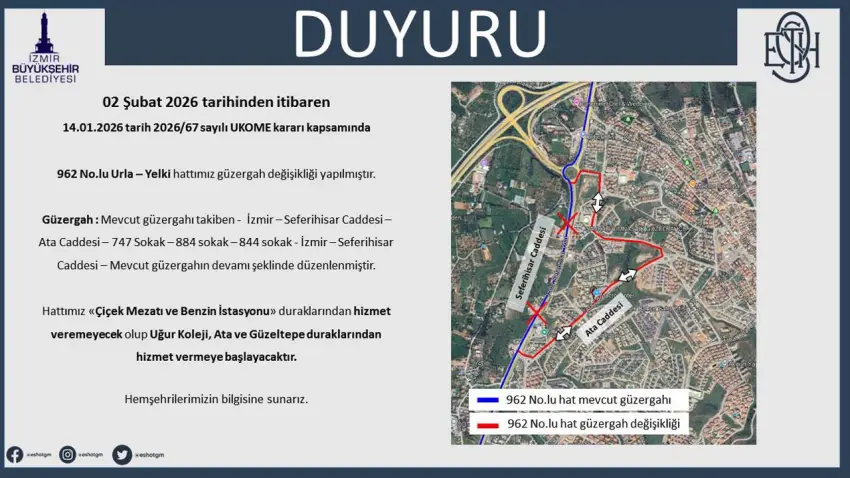 Urla ve Güzelbahçe arasında sefer düzenleyen 962 No’lu Urla – Yelki hattında da güzergah değişikliği yapıldığını açıklayan ESHOT, hattın 2 Şubat Pazartesi gününden itibaren Ata Caddesi üzerinden seferlerini gerçekleştireceğini açıkladı. Yeni düzenlemeye göre Seferihisar Caddesi üzerinden, Ata Caddesi’ne geçiş yapacak olan hat, burada Uğur Koleji, Ata ve Güzeltepe duraklarına hizmet götürecekken; eski güzergah üzerinde kalan Çiçek Mezat’ı ve Benzin İstasyonu duraklarına ise artık hizmet veremeyecek.