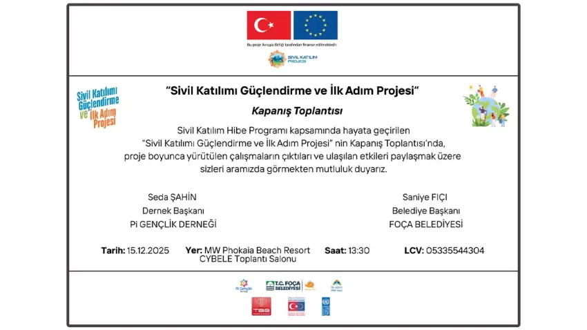 “Pi Gençlik Derneği ve Foça Belediyesi’nin ‘Sivil Katılımı Güçlendirme ve İlk Adım Projesi’, 15 Aralık’ta MW Phokia Beach & Resort’ta düzenlenecek kapanış toplantısıyla tamamlanıyor. Bir yıllık çalışmanın ürünü Sosyal Etki Raporu toplantıda kamuoyuna sunulacak.