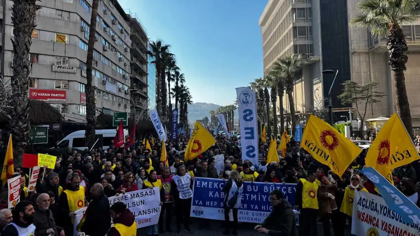 Kamu Emekçileri Sendikaları Konfederasyonu (KESK), ek zam talebiyle ülke genelinde 1 günlük iş bırakma eylemi gerçekleştirdi. İzmir’de KESK’e bağlı sendikaların üyeleri Konak SGK binası önünde bir araya gelerek basın açıklaması yaptı. Açıklamayı okuyan KESK İzmir Dönem Sözcüsü Başak Edge Gürkan, kamu emekçilerinin TÜİK verileriyle belirlenen maaş artışları karşısında hızla yoksullaştığını belirterek 2026 yılına seyyanen artış dâhil ortalama yüzde 12,5 zamla girildiğini, buna karşın özellikle kira başta olmak üzere temel harcamalarda çok daha yüksek artışlar yaşandığını söyledi. Gürkan, toplu sözleşme sürecinin kamu emekçileri aleyhine işletildiğini savunarak, yaşanan tablonun iktidar, yandaş konfederasyonlar ve Hakem Kurulu’nun ortak sonucu olduğunu ifade etti ve kamu emekçilerini mücadeleye çağırdı.