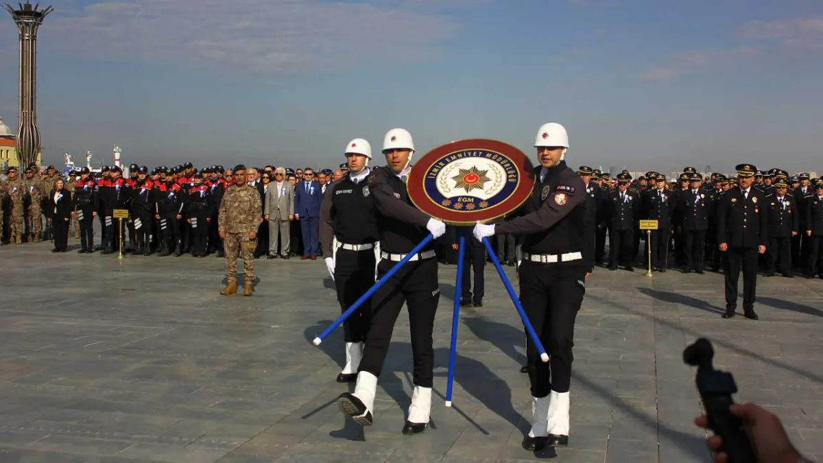 Türk Polis Teşkilatı’nın 181’inci kuruluş yıl dönümü kapsamında İzmir’de çelenk sunma töreni düzenlendi. Cumhuriyet Meydanı’nda gerçekleştirilen törende, İzmir İl Emniyet Müdürü Celal Sel, Rüştü Ünsal Polis Meslek Yüksekokulu Müdürü Ökkeş Bulut ve emniyet teşkilatı mensupları yer aldı. Sel ve Bulut tarafından Atatürk Anıtı’na çelenk sunumu yapılan törende Saygı duruşu ve İstiklal Marşı’nın okunmasından sonra törende Sel tarafından tören anı defteri imzalandı. Defterin imzalanmasının ardından düzenlenen kortej geçişi ile resmi tören son bulurken Sel, tören sonrası emniyet mensupları ile anı fotoğrafları çekildi.