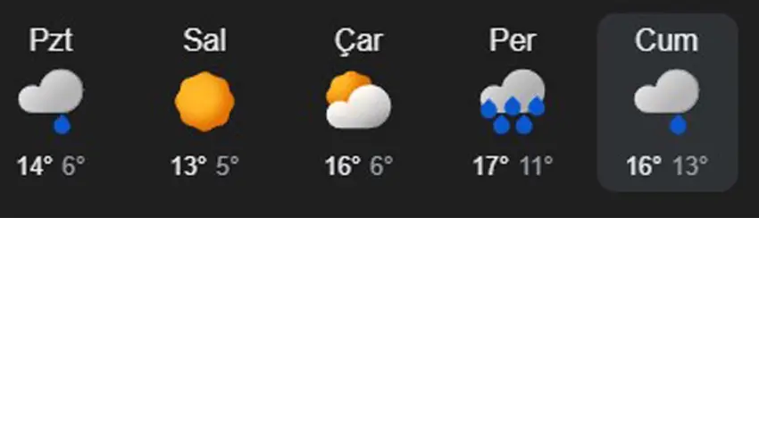 Paylaşılan verilere göre; pazartesi günü 16 derecelik gündüz hava sıcaklığının yaşanacağı kentte Salı 13, Çarşamba 16, Perşembe 17 ve Cuma 16 derecelik gündüz hava sıcaklıkları yaşanacak. Hafif yağmurla geçen Pazartesinin ardından Salı gününde güneşli bir havanın olacağı kentte Çarşamba gökyüzü çok bulutlu olacakken, Perşembe ve Cuma günleri ise yağmur bulutları tekrardan gökyüzüne hakim olacak. Kentte Perşembe günü kuvvetli sağanak yağış yaşanması beklenirken, Cuma günü ise hafif yağmur gözlemlenecek.