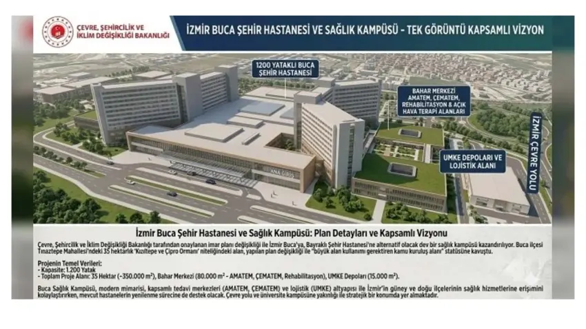 İzmir’de sağlık yatırımlarına bir yenisi daha ekleniyor. Buca ilçesine bağlı Tınaztepe Mahallesi’nde yapılması planlanan Buca Şehir Hastanesi projesi için önemli bir planlama adımı atıldı. Çevre, Şehircilik ve İklim Değişikliği Bakanlığı tarafından hazırlanan 1/100.000 ölçekli çevre düzeni planı değişikliği askıya çıkarıldı. Plan değişikliğine göre, Tınaztepe Mahallesi’nde bulunan 53097 ada 1 parselin yaklaşık 35 hektarlık bölümünde şehir hastanesi yapılması planlanıyor. Söz konusu alanda ayrıca Bahar Merkezi Projesi ile UMKE (Ulusal Medikal Kurtarma Ekibi) depolarının da yer alması öngörülüyor.