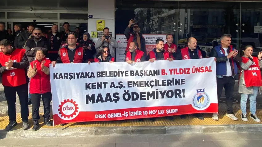 KEMAL ÖZKURT / Karşıyaka Belediyesi bünyesindeki Kent A.Ş.’de çalışan 540 işçi, 7 aydır ödenmeyen maaş alacaklarının yatırılması talebiyle eylemlerini sürdürdü. Sendika yönetimi, bugün Belediye Başkanı Yıldız Ünsal ile yapılması planlanan görüşmenin, dün gerçekleştirilen meclis toplantısındaki protestonun ardından iptal edildiğini açıkladı. Bunun üzerine işçiler, haklarını talep etmek için belediyenin ana hizmet binası önünde basın açıklaması yaparak tepkilerini bir kez daha dile getirdi.