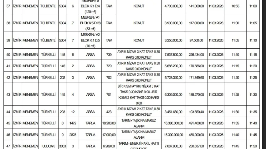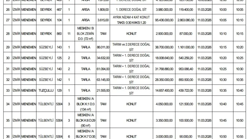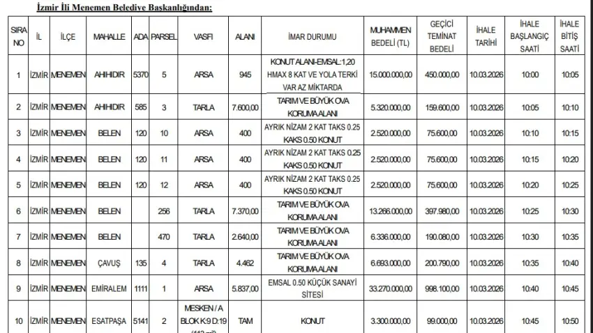İhaleler 10 ve 11 Mart 2026 tarihlerinde Menemen Belediyesi Meclis Salonu’nda yapılacak. Geçici teminat bedelleri taşınmaza göre 75 bin TL ile 2 milyon 863 bin TL arasında değişiyor.