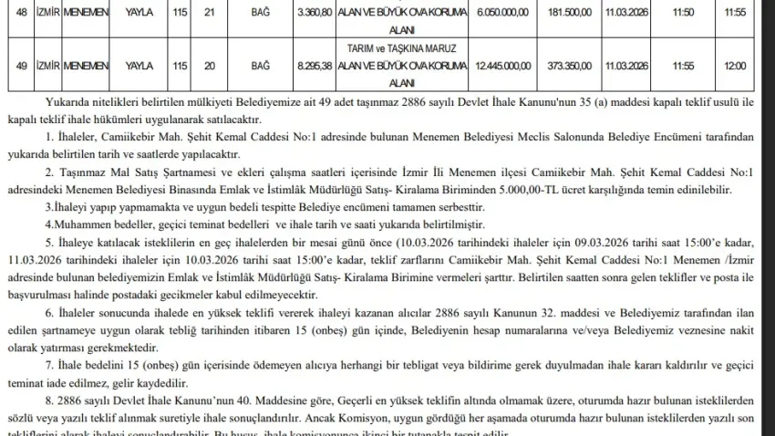 Resmi Gazete’de yayımlanan kararla, Menemen Belediyesi mülkiyetinde bulunan toplam 49 taşınmazın satışa çıkarıldığı duyuruldu. Arsa, tarla, bağ, zeytinlik ve belediyeye ait konutlardan oluşan geniş portföy; konut imarlı parsellerden küçük sanayi alanına, büyük ova koruma alanlarından 1. ve 2. derece doğal sit şerhli arazilere kadar farklı statülerdeki taşınmazları kapsıyor. Satışların 2886 sayılı Devlet İhale Kanunu’nun 35/a maddesi uyarınca kapalı teklif usulüyle yapılacağı belirtilirken, ihale listesinde yer alan muhammen bedellerin toplamı yaklaşık 572 milyon TL’yi buluyor.