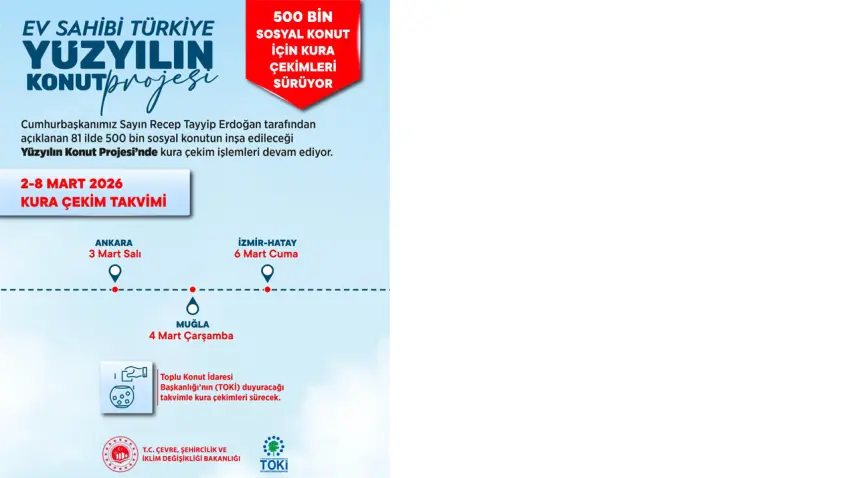 Çevre, Şehircilik ve İklim Değişikliği Bakanı Murat Kurum, şu ifadeleri kullanmıştı: “Yüzyılın Konut Projesi’nde kura çekimlerinde sona geliyoruz. Bugüne kadar 75 şehirde 331 bin 833 konutumuzun hak sahiplerini belirledik. Bu hafta Ankara, İzmir, Hatay ve Muğla’da kura heyecanı var. 71 bin 799 anahtarımızın daha sahiplerini belirleyecek, sevincini milletimizle paylaşacağız.”