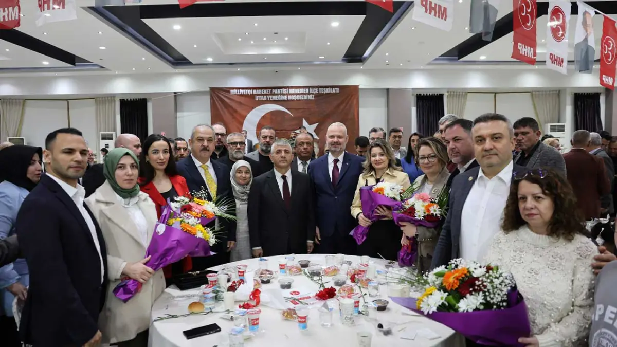 MHP İzmir İl Başkanı Veysel Şahin ise konuşmasına Menemen Belediye Başkanı Aydın Pehlivan'a ithafen, "Biz senden razıyız, Allah da razı olsun." sözleriyle başladı. Şahin, "Mübarek Ramazan ayının tüm insanlığa hayırlar getirmesini diliyorum. İftar sofraları sadece yemek sofraları değil, kardeşliğin pekiştiği sofralardır. Ramazan, millet olma şuurunun en güçlü şekilde hissedildiği aydır. Bugün aynı zamanda Dünya Kadınlar Günü fakat bu mübarek ayda kadınlar, çocuklar ve Müslümanlar öldürülüyor. Ramazan ayında tüm İslam coğrafyası tedirgin. Bu durumda bize düşen güçlü olmak değil, çok güçlü olmaktır. Güç ise sadece ekonomiyle silahla gelmez. Asıl güç, istiklal ve istikbale yürekten bağlı olmaktır. Bugün uluslararası hukuk ayaklar altındadır. İnsan hakları hiçe sayılmaktadır. Adalet güçlü olanın çıkarına göre eğip bükülmektedir. Asıl hedef Müslümanı Müslümana kırdırarak bir çatışma zinciri kurmaktır. İşte böyle bir dönemde Genel Başkanımız Devlet Bahçeli'nin 'Terör bitsin de varsın boynuma ip atılsın!' haykırışı, iç cephemizin sağlam, birlik ve kardeşliğimizin ne kadar önemli olduğunu gösteren hayati bir uyarıdır. Çünkü Türkiye sadece bir devlet değil, mazlumların umudu ve gönül coğrafyamızın teminatıdır. Unutmayalım, biz bin yıldır aynı kıble ve kaderi paylaşan büyük bir milletiz. Bu mübarek gecede niyazım odur ki, birliğimiz daim, kardeşliğimiz baki, soframız bereketli, gönüllerimiz huzurlu olsun." dedi.