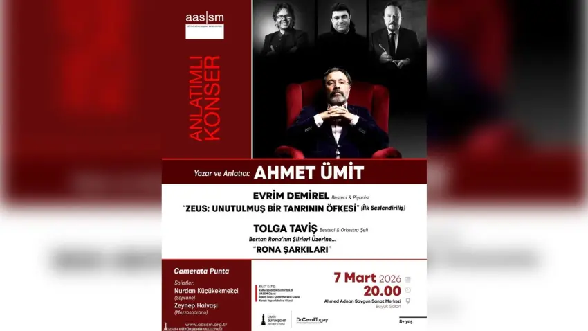 Ahmet Ümit’in kaleminden çıkan, bestesi Evrim Demirel imzası taşıyan “Zeus: Unutulmuş Bir Tanrının Öfkesi” anlatımlı konseri, ilk seslendirilişiyle 7 Mart’ta sanatseverlerle buluşacak. Mitoloji ile çağdaş anlatımı bir araya getiren eser, metni ve müziğiyle sahneye taşınacak.