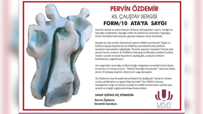 Uluslararası seramik sanatçısı Pervin Özdemir tarafından yürütülen Kil Çalıştayı 2025 kapsamında hazırlanan “Form 10/ATA’YA SAYGI” sergisi, 10–19 Kasım tarihleri arasında Urla Belediyesi Aryom Kültür Merkezi’nde ziyarete açılıyor. Atatürk’e adanan özel temasıyla dikkat çeken sergide, 22 katılımcının özgün, estetik ve kültürel birikimlerini yansıttığı seramik çalışmaları sergilenecek.