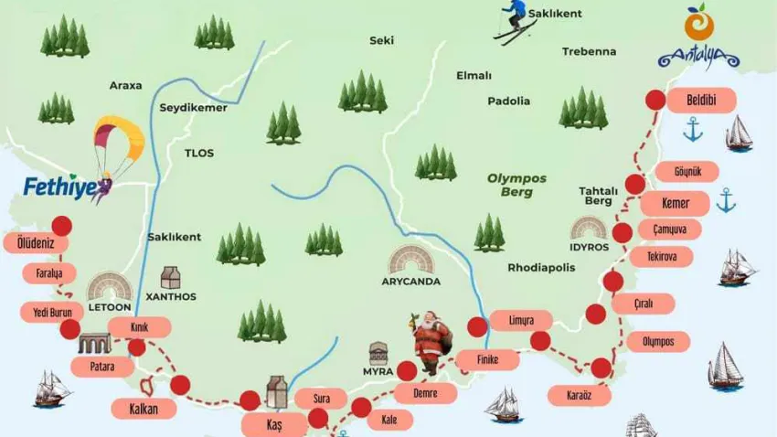 Mola vermek istediğinizde kendinizi Akdeniz’in masmavi sularına atmak isterseniz eğer, Patara, Olimpos ve Adrasan Koyu gibi noktalarda berrak sularda yüzebilirsiniz. Eğer tarihi kalıntılar dikkatinizi çekiyorsa harita üzerinden Phaselis, Simena, Myra ve Xanthos gibi 20'den fazla antik şehir bulunuyor.