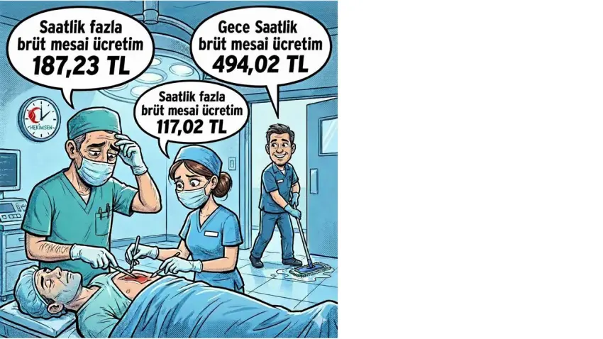 Doktor ve hemşirelerin fazla mesai ödemeleri sabit kalırken, 4/D’li işçiler için çok daha avantajlı bir sistem uygulanıyor. Gündüz mesaisi için 479,90 TL, gece için 494,02 TL brüt ücret alan temizlik personeli ayrıca gece çalışmasına 98,90 TL fark alıyor. Bu ödemeler SGK matrahına dahil olduğu için emekliliğe de yansıyor. Sağlık çalışanlarının fazla mesai ödemeleri ise yalnızca bordroda kalıyor, uzun vadeli hiçbir hak sağlamıyor. Üstelik maaş farkı da dikkat çekici boyutta. Sekiz yıllık lisans mezunu bir hemşire 58 bin TL maaş alırken, sınavsız kura ile göreve başlayan temizlik görevlisinin maaşı 73 bin TL’yi aşabiliyor.