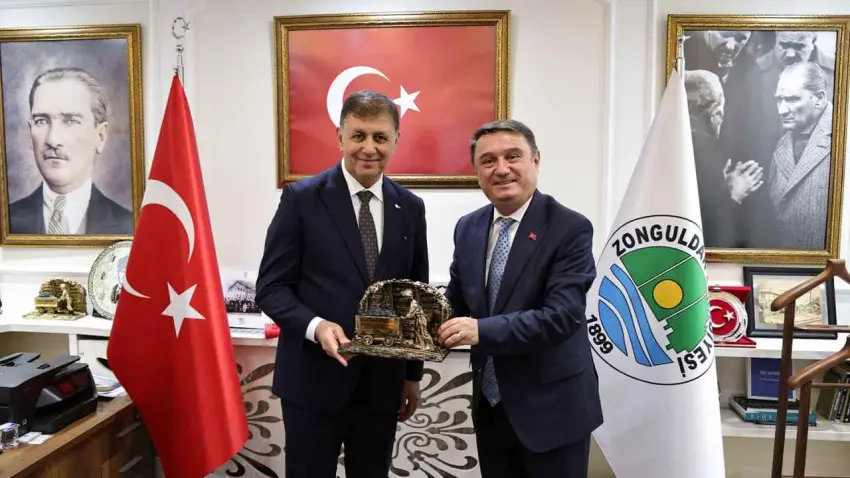 Başkan Tugay CHP İl Başkanlığı’nın ardından Zonguldak Belediyesi’ni de ziyaret etti. Ev sahibi Belediye Başkanı Tahsin Erdem makamında Büyükşehir Belediye Başkanı Tugay’a isminin yazılı olduğu madenci heykeli ve Devrek bastonu hediye etti.