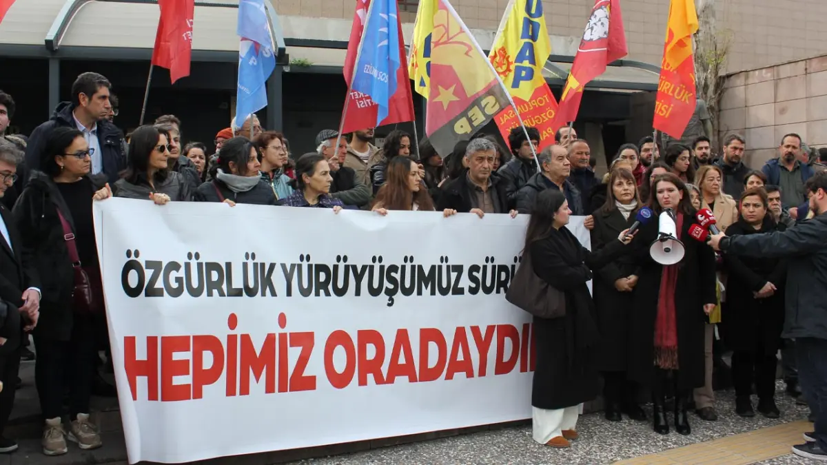 BERKAY ERDEN / Cumhuriyet Halk Partisi (CHP) Genel Başkan Yardımcısı ve İzmir Milletvekili Gökçe Gökçen ile CHP İzmir Milletvekili Yüksel Taşkın, 19 Mart 2025 tarihinde İstanbul Büyükşehir Belediye Başkanı Ekrem İmamoğlu'nun gözaltına alınmasına tepki olarak İzmir’de düzenlenen eylemlerde tutuklanan gençlere destek olmak amacıyla İzmir Adliyesi’ne geldi. “Cumhurbaşkanına hakaret” suçlamasıyla gözaltına alındıktan sonra tutuklanan gençlerin yargılandığı Adliyenin C Kapısı girişinde basın açıklaması yapan ikili gerçekleşecek duruşma öncesi yapılan açıklamada, dava sürecine ve gençlerin tutukluluğuna ilişkin değerlendirmelerde bulunuldu. Dava öncesinde gençlere destek olmak amacıyla DEM Parti İstanbul Milletvekili Kezban Konukçu, Emekçi Hareket Partisi, Ezilenlerin Sosyalist Partisi, Toplumsal Özgürlük Partisi, Sosyalist Emekçiler Partisi adliye kapısı önünde yer alırken, Gökçen ve Taşkın yaptıkları açıklamalar ile tutuklu yargılamalar nedeniyle iktidara tepki gösterdi.