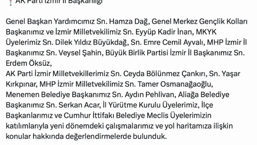 İzmir'de Cumhur İttifakı temsilcileri stratejik bir toplantı düzenledi ve gelecek dönem çalışmalarını ve yol haritasını belirledi. Toplantının ardından İzmir İl Başkanı Bilal Saygılı, sosyal medya hesabından yaptığı paylaşımla değerlendirmelerde bulundu
