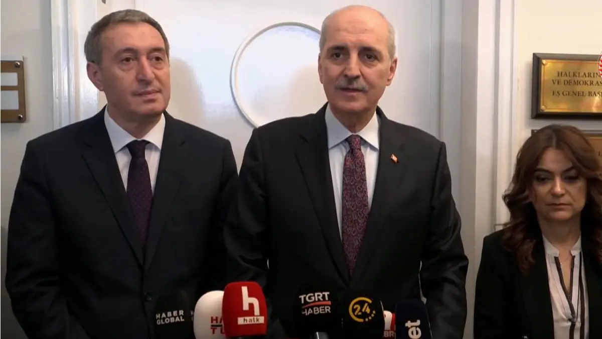 TBMM Başkanı Numan Kurtulmuş, DEM Parti Eş Genel Başkanları Tülay Hatimoğulları ve Tuncer Bakırhan'ı Meclis'teki makamında ziyaret etti. Hatimoğulları ve Bakırhan, Kurtulmuş'u kapıda karşıladı. Basına kapalı gerçekleşen görüşme, yaklaşık 35 dakika sürdü. Görüşmenin ardından Numan Kurtulmuş ve Tuncer Bakırhan açıklamalarda bulundu.