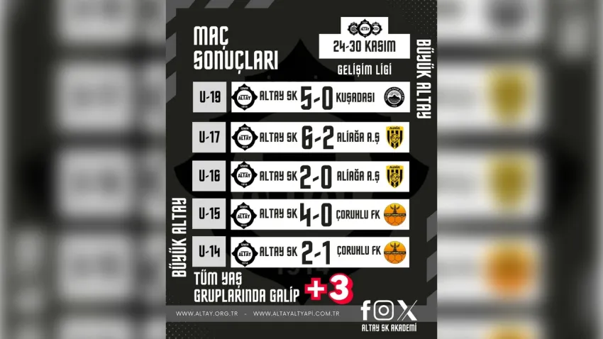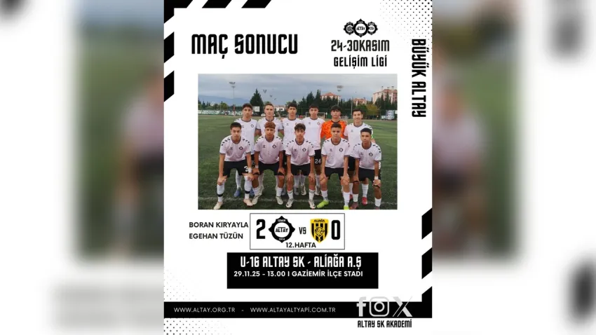 Altay’ın U19 ekibi, Gelişim Ligi 4'üncü Grup’ta oynadığı son üç maçta İzmirspor’u ve deplasmanda Karşıyaka’yı 5-1, Kuşadasıspor’u ise 5-0 mağlup ederek çıkışını sürdürdü ve 4'üncü sıraya yükseldi. Bu sonuçlarla zirveyle arasındaki fark 4 puana indi.