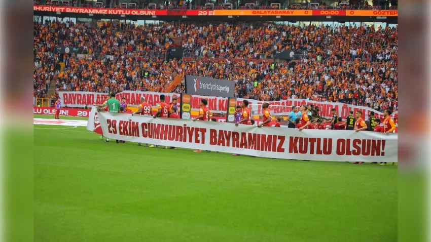 Galatasaray - Göztepe karşılaşması öncesi 29 Ekim Cumhuriyet Bayramı unutulmadı. Ev sahibi ekibin oyuncuları ısınmaya, 29 Ekim Cumhuriyet Bayramı için hazırlanan özel kırmızı tişörtlerle çıkarken, statta 10'uncu Yıl Marşı yankılandı. Sarı-kırmızılı taraftarlar, “Türkiye Cumhuriyeti Mesut, Muvaffak ve Muzaffer Olacaktır”, “Milyonlarca Şehidin Adıdır Cumhuriyet” ve “Bayrakları Bayrak Yapan Üstündeki Kandır, Toprak Uğrunda Ölen Varsa Vatandır” yazılı pankartlar açarken, Türk bayrakları sallayarak görsel bir şölen yarattı.