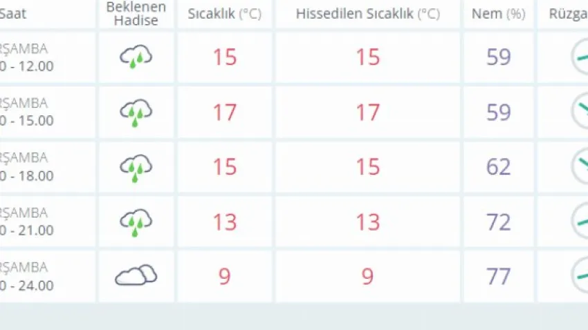 Saat 15.00 ile 18.00 saatleri arasındasağanak yağmurlu bir hava görünecek olup, hava sıcaklığı 18 dereceye düşecek. Hissedilen sıcaklık da 18 derece olacak. Nem oranı ise yüzde 50 olacak. Rüzgar batı yönünden esecek.