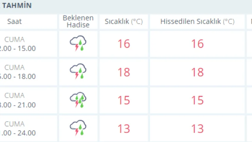 Akşam 21.00 ile gece 24.00 arasında ise sağanak yağış etkisini sürdürecek. Hissedilen sıcaklık ise 13-16 dereceler arasında değişim gösterecek.